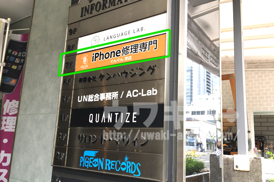 7階まで上がってみました。エレベーターを降りてすぐが入居テナントのドアになっています。7階に部屋は1室です。そこは完全にiPhone修理専門店でした。探偵事務所の気配はしません。