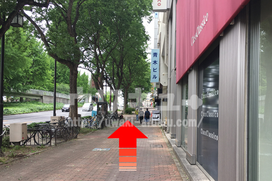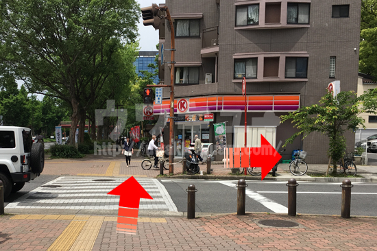 矢場駅から出て最初の交差点、若宮大通久屋交差点が見えてきました。この交差点を渡らず右に曲ります。
