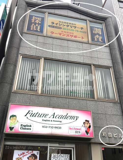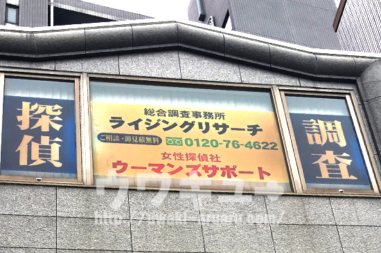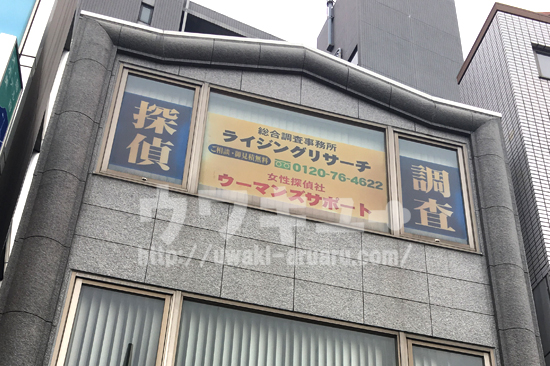 ビルの全景写真です。3階の窓一面にライジングリサーチ・探偵・調査の文字が確認できます。女性探偵社「ウーマンズサポート」の社名も並んでいます。