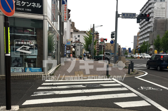 「覚王山西」交差点です。横断歩道の先にペットショップ「タツミケンネル」があります。タツミケンネルの奥がライジングリサーチです。