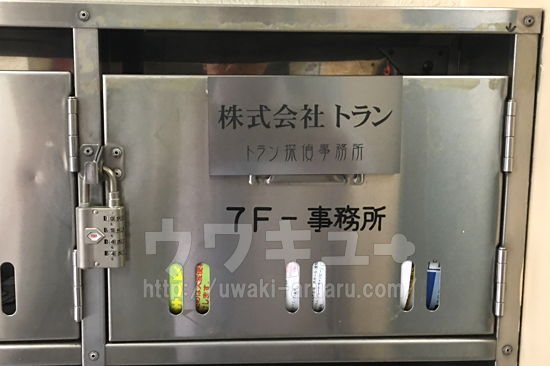エントランス内の郵便ポストに「トラン探偵事務所」の表示がありました。ポストは施錠されていて、セキュリティー面もバッチリです。