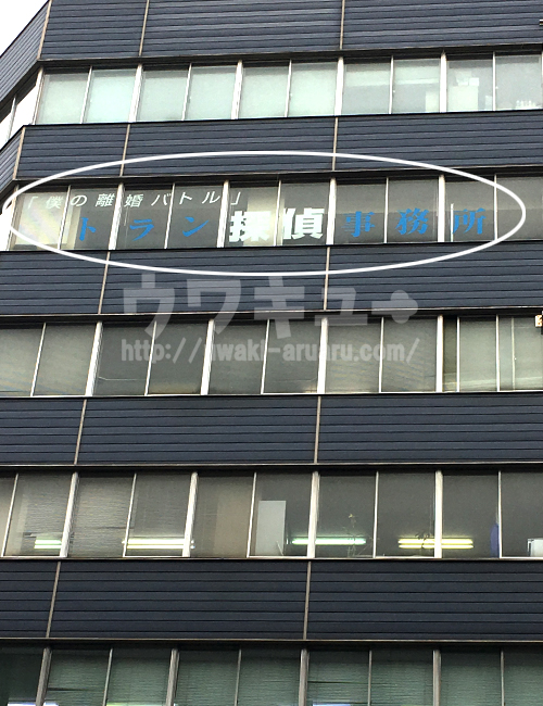 ビル全景です。窓一面に「トラン探偵事務所」と書かれています。まちがいなく、所在地に事務所がありました!ところでトランの文字の上にある「僕の離婚バトル」とは何のことでしょう?!