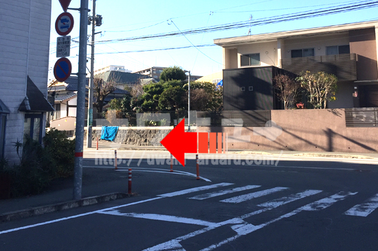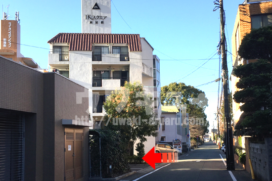 路地に入り、一つ目の角にマンション「IKスクウェアー新屋敷」があります。このマンション前を左に曲がります。