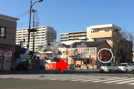 左に曲がってしばらく進むと、明光義塾があります。明光義塾の向こうの路地を右に曲がります。
