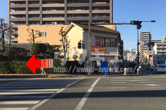 150メートルほど進むと大きな交差点に出ます。交差点の斜め向かい、オレンジのテントのある方面に進みます。