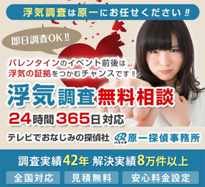 以前、私は原一探偵事務所に取材に行きました。その時、バレンタインなどのイベント前後は夫が浮気する確率も高くなり、浮気の証拠を掴むことができるとお聞きしました。イベント効果で、二人の気持ちも盛り上がっていますし、気も緩むのでしょう。バレンタインデーは決定的証拠を掴む絶好のチャンスなのです。