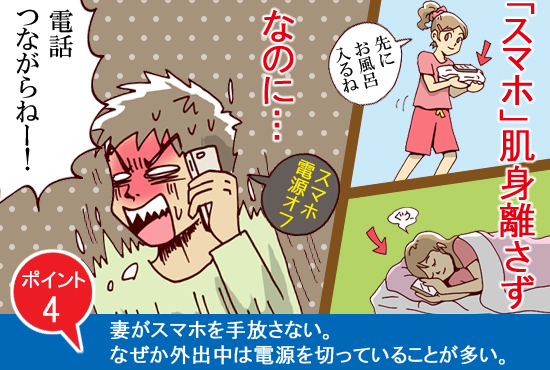 あとはなかなか電話に出なかったり、折り返しの電話が遅い、電源が入っていないことが多いことがあります。 折り返し妻から電話がかかってきて、携帯電話の調子がおかしい、地下鉄乗ってたから電波が悪い、ママ友と話していた~などと言い訳を始めます。